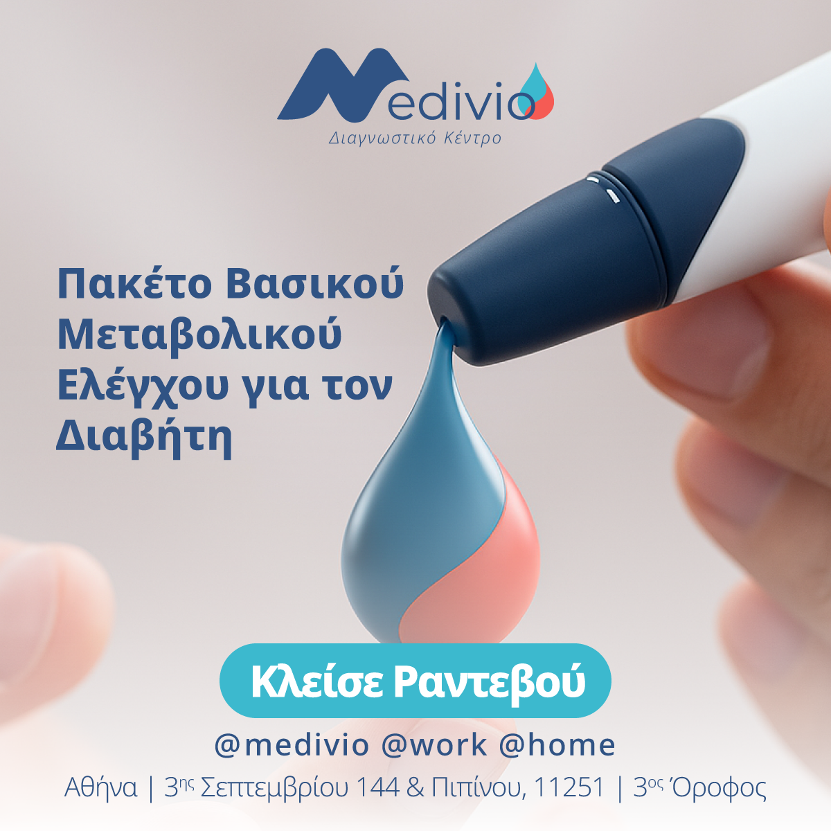 Ο σακχαρώδης διαβήτης μπορεί να μην δίνει πάντα συμπτώματα, όμως επηρεάζει ολόκληρο τον οργανισμό — από την ενέργεια και το βάρος, μέχρι την καρδιά και τα αγγεία. Στο MEDIVIO πιστεύουμε ότι η γνώση είναι δύναμη: με έναν απλό αιματολογικό έλεγχο μπορείς να γνωρίζεις τα επίπεδα του σακχάρου σου και να προλάβεις επιπλοκές πριν καν εμφανιστούν. Ειδικά για την Παγκόσμια Ημέρα Διαβήτη (14 Νοεμβρίου), προσφέρουμε προνομιακά πακέτα Μεταβολικού Ελέγχου & Διαβήτη για κάθε ηλικία.